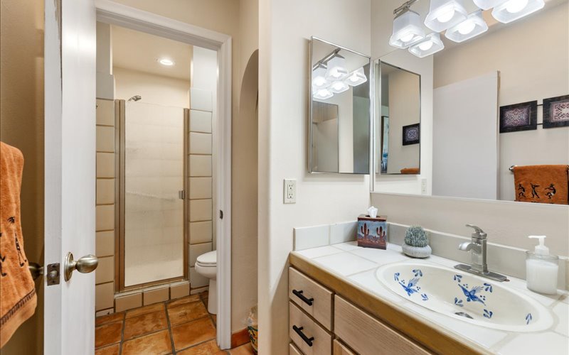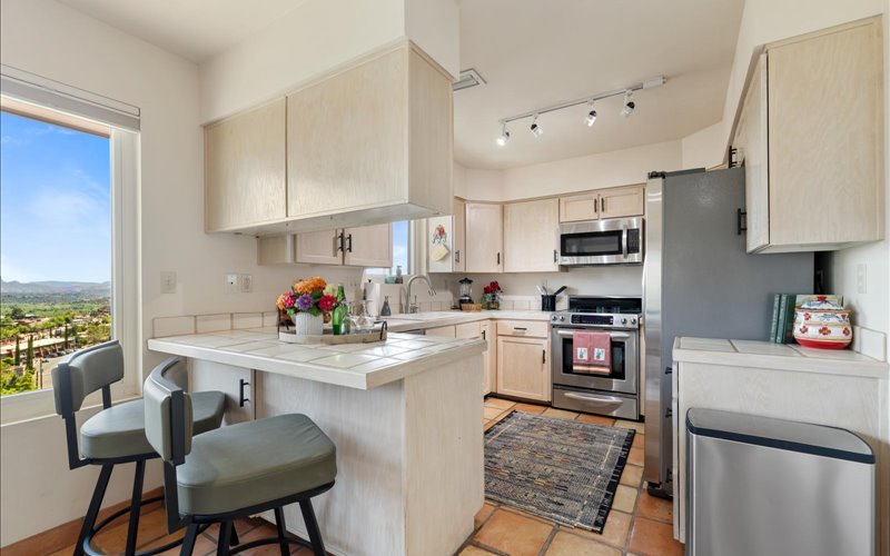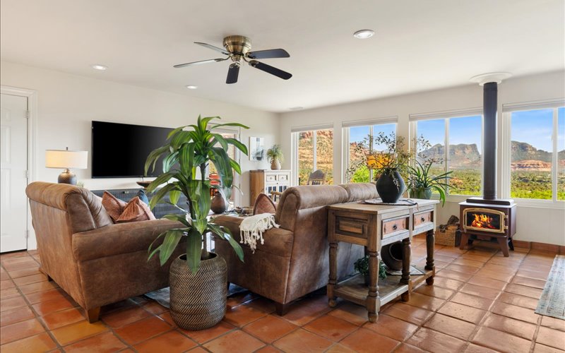 Upon entering this thoughtfully crafted Chalet, you’ll be welcomed by an open concept living space adorned with modern furnishings and accents. The living room beckons you to relax by large windows that frame stunning views of Sedona’s red rock landscapes, allowing the beauty of nature to become an integral part of your indoor experience.